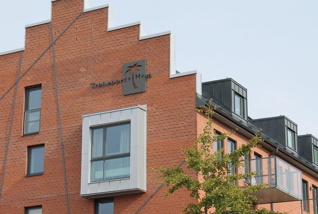 Byggnadens fasader har kulör och struktur med koppling till äldre byggnader i området, med detaljer i falurött trä runt entrén.
